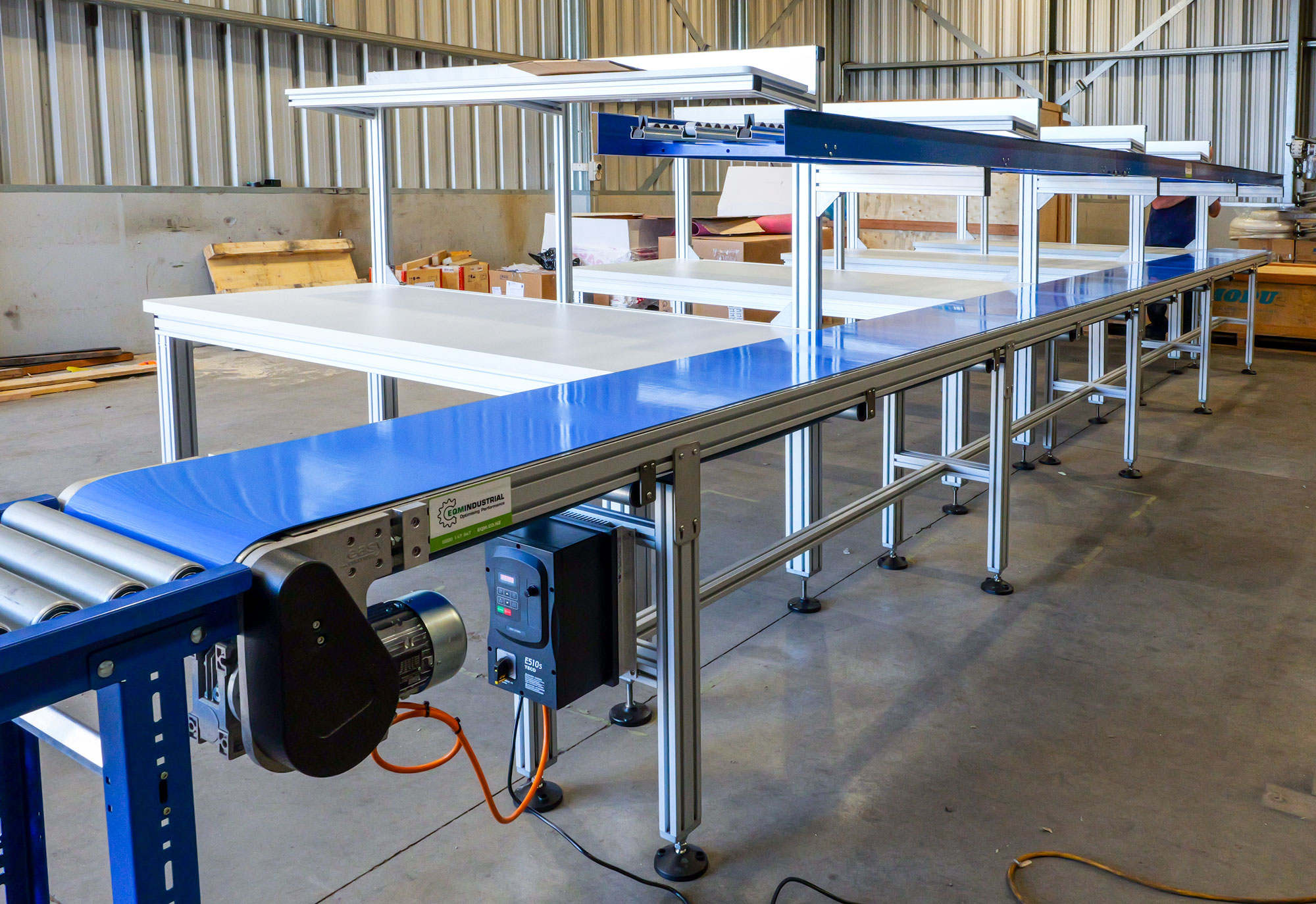 EQM designed a custom-built order packing line using modular Easy EBS80 belt conveyor technology. This conveyor provided the backbone for the system, with four evenly spaced packing benches constructed from Slotpro aluminium framing and laminated tops.