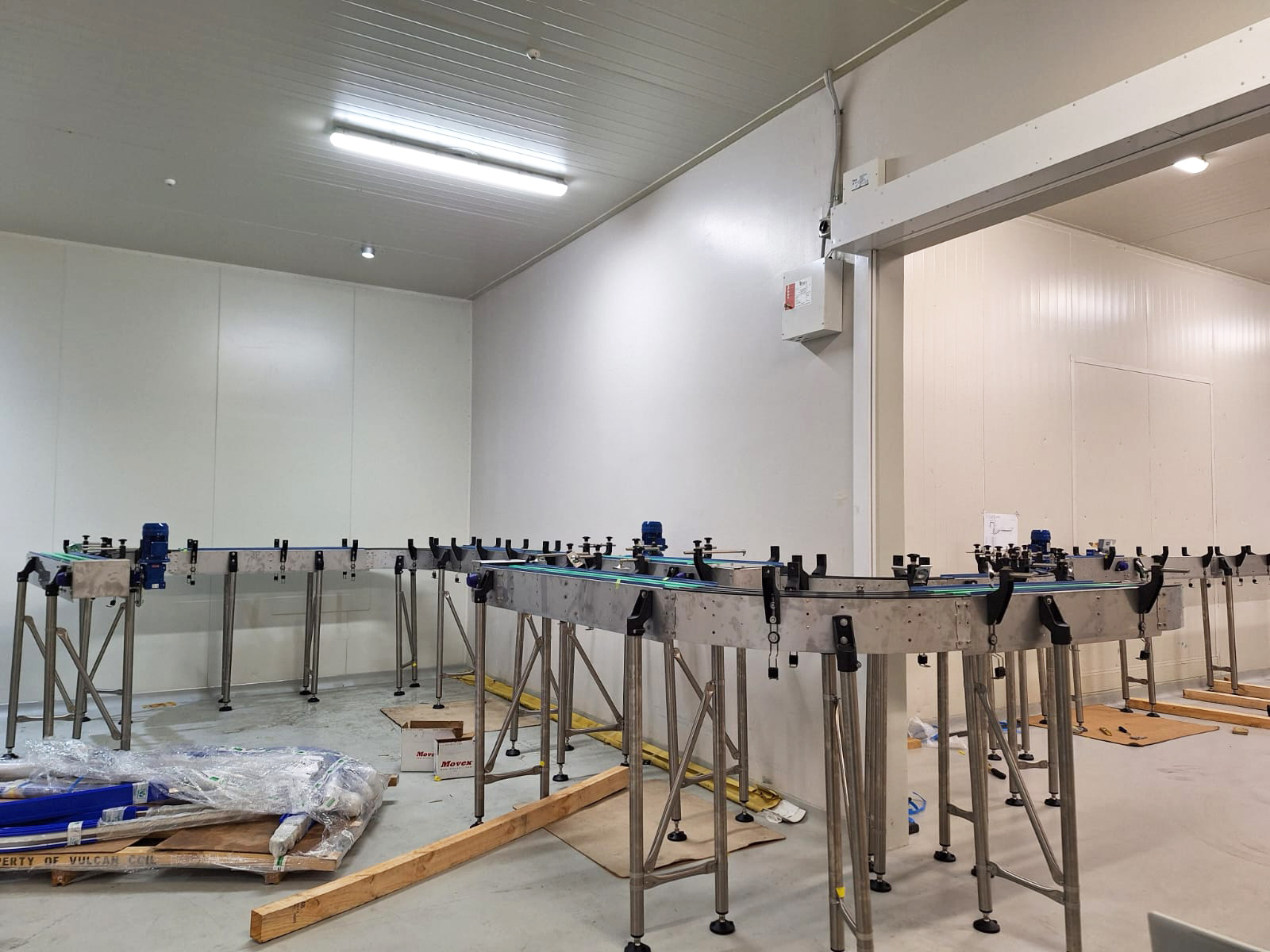 - Two Movex slatband chain conveyors on stainless steel leg assemblies with adjustable feet, designed to navigate doorways and walls.