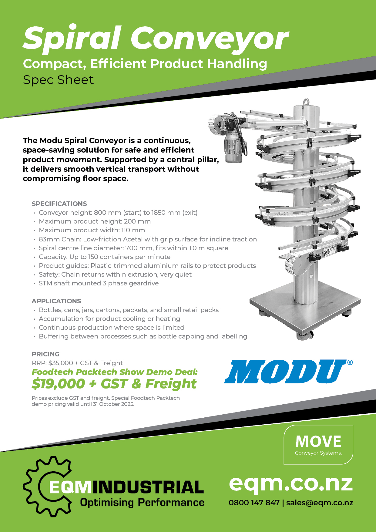 - Spiral centre line diameter: 700 mm, fits within 1.0 m square